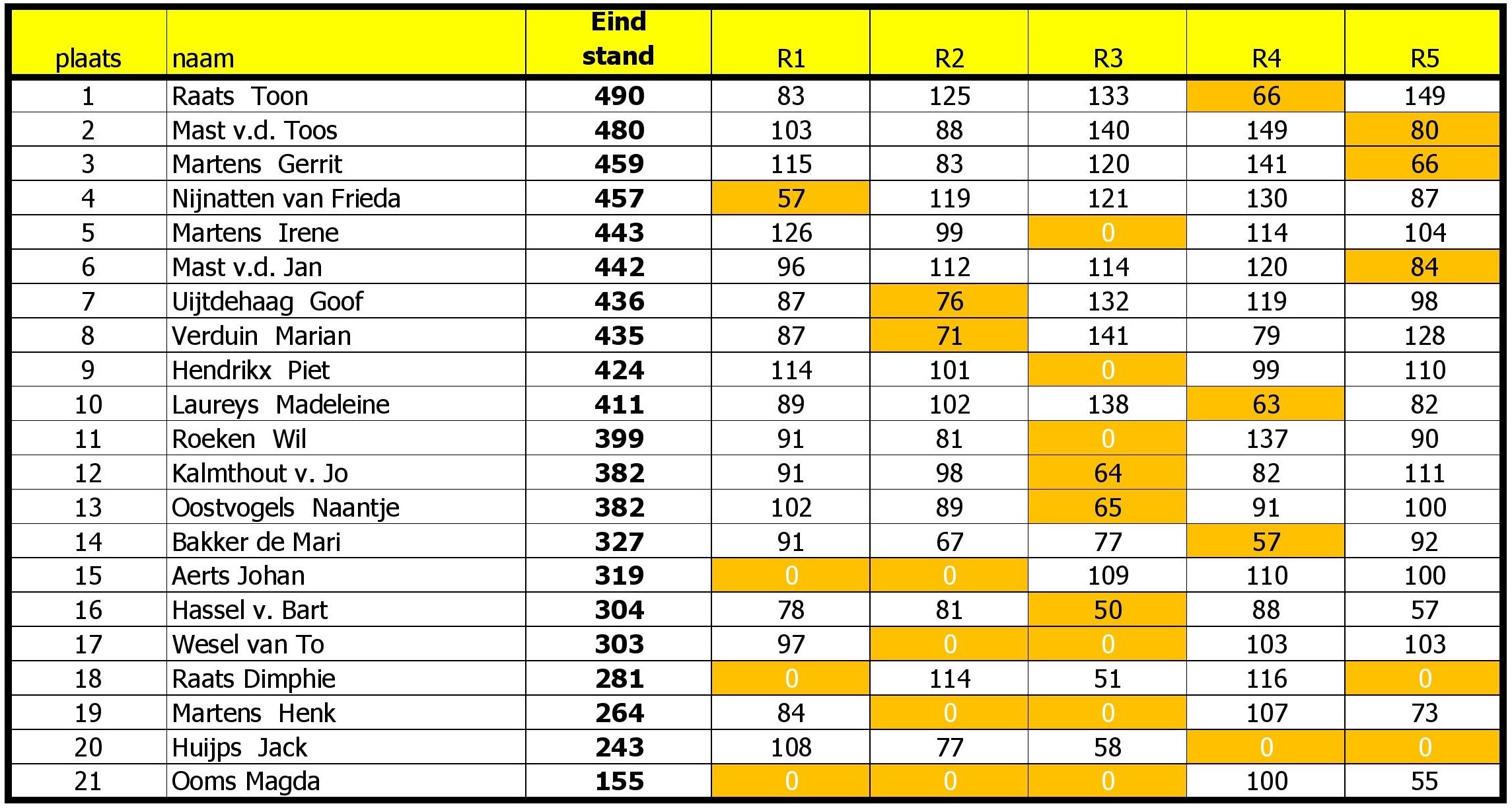 De oranje gekleurde cellen zijn de laagste scores en worden dus niet meegeteld in de totaalscore.