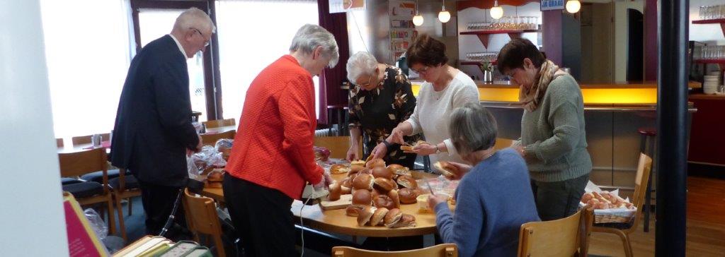 Al vroeg was de ‘smeerploeg’ bezig met het opsmeren en beleggen van de broodjes die deze keer met een bijdrage van