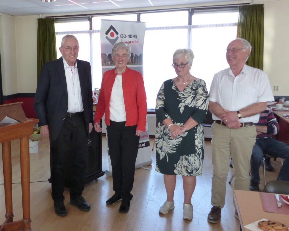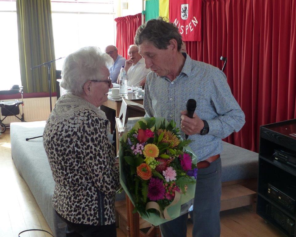 Marianne Mens-Bastiaanse wordt hartelijk bedankt voor haar inzet in het bestuur en voor de nog vele andere inspanningen voor KBO Nispen. Marianne ontvangt uit handen van de vicevoorzitter Ad Uitdehaag een boeket bloemen.