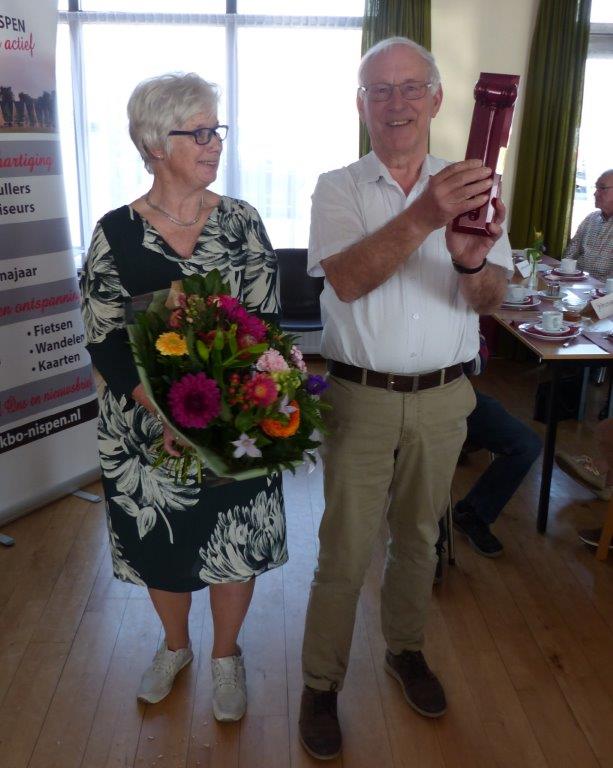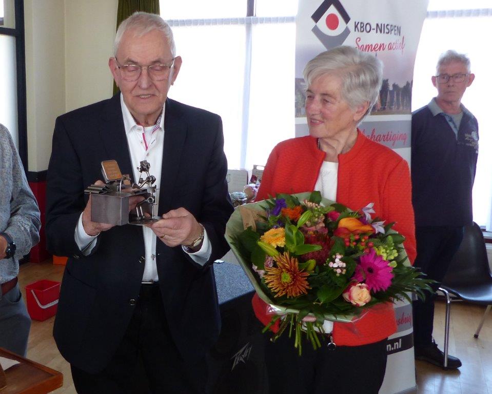 … en Jac kreeg als blijk van waardering van KBO Nispen een ‘Voorzittershamer’ en zijn vrouw Mia kreeg vanwege haar inspanningen op de achtergrond ook een mooie bos bloemen.