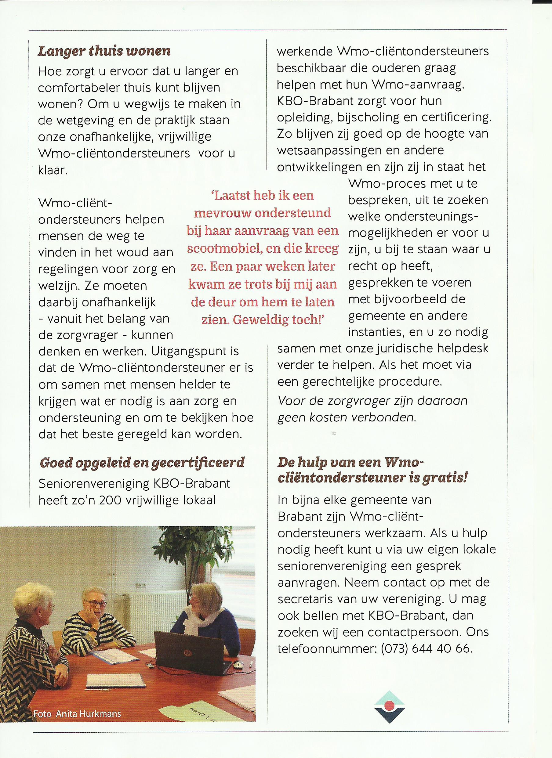 In de WMO 2015 (Wet Maatschappelijke Ondersteuning) die door de gemeente wordt uitgevoerd, wordt onderscheid gemaakt tussen formele (beroepsmatig) en informele (vrijwillige) cliëntenondersteuners. Iedere gemeente is verplicht om een inwoner die een aanvraag doet te wijzen op de mogelijkheid te worden bijgestaan door een cliëntondersteuner. Elke inwoner die bij de gemeente Roosendaal een aanvrage doet voor WMO ondersteuning moet een ondersteuner kunnen inschakelen die bij zijn of haar situatie past en waar hij of zij vertrouwen in heeft. Daarom kunnen alle ouderen in de gemeente Roosendaal een beroep doen op de cliëntondersteuners van de KBO. Onze vier deskundige clientondersteuners gaan met u in gesprek over uw situatie en behoefte aan ondersteuning. Zij hebben een degelijke WMO-kennis.