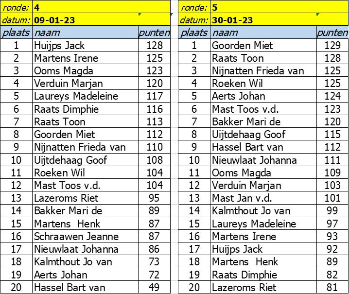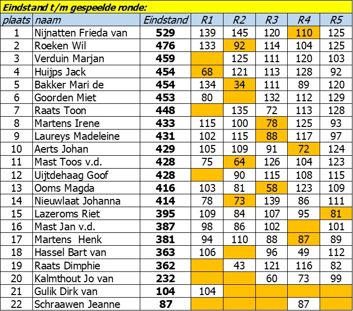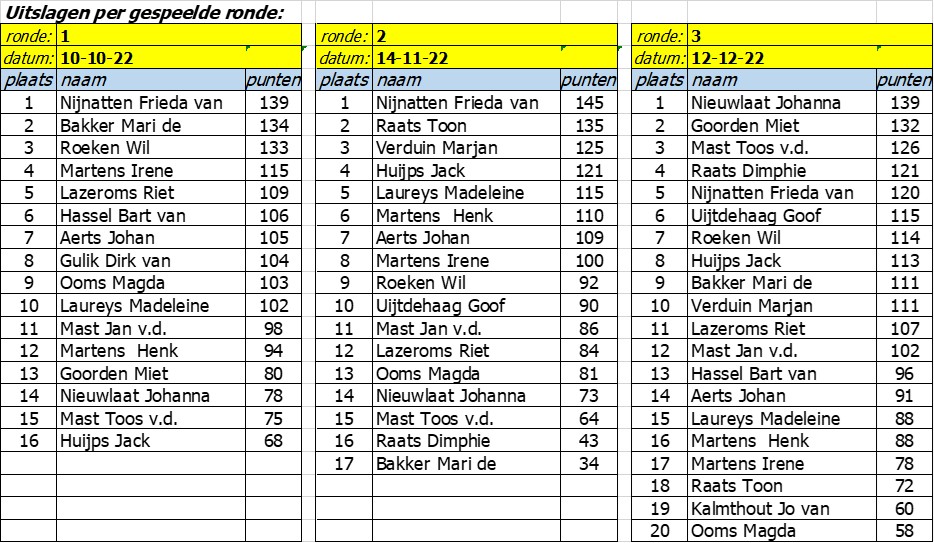 Uitslagen Rikken voor ouderen 2022-2023 De gekleurde velden zijn de laagste rondeuitslagen en worden niet meegeteld in de eindstand. Terug naar de pagina ‘Kaarten’