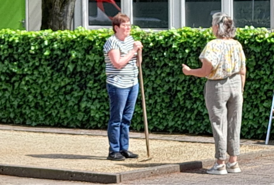 Het netjes gladharken van de baan kan soms best lang duren, Lilianne en Elly hadden elkaar veel te vertellen. Maar uiteindelijk lag de baan er weer mooi strak bij en konden de wekelijkse jeu de boules partijen weer beginnen.